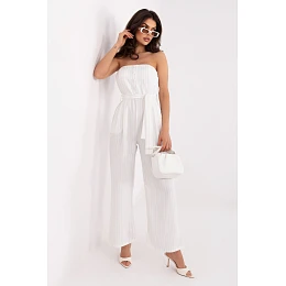 Dámský overal se pruhy je elegantní a funkční volbou, která se hodí jak do každodenních stylizací, do práce, tak i na formální události. Kombinace klasiky s moderním střihem vytváří pohodlný a zároveň stylový outfit. Model je vyroben z polyesteru spojeného s elastanem, co zajišťuje lehkost, jemnou pružnost a pohodlí během celého dne. Overal má dlouhé široké nohavice, bez rukávů a obdélníkový výstřih, který jemně zdůrazňuje ramena. Vsazené vyztužené košíčky zaručují správnou oporu prsou a estetický tvar. Přední stranu zdobí dekorativní knoflíky a v pasu je pásek, který lze uvázat a perfektně přizpůsobit postavě. Overal má praktické kapsy a na zádech roucha s gumou, která zvyšuje pohodlí a přizpůsobení. Díky dominujícímu pruhovanému vzoru získává celkový outfit moderní charakter, zatímco široké nohavice dodávají styl a lehkost pohybům. Jedná se o univerzální overal pro ženy, které oceňují eleganci, pohodlí a prakt