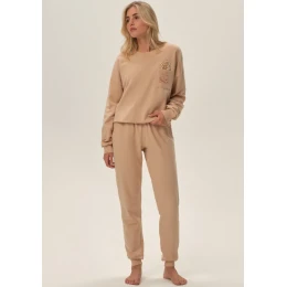 Dámska tepláková súprava od spoločnosti Henderson, vyrobená z mäkkej hladkej bavlny a zateplená z vnútornej strany. Mikina má dlhé rukávy s pleteným lemom, okrúhly výstrih a vrecko s vianočným motívom. Tepláková súprava je dlhá, na bokoch má vrecká a je zakončená pleteným lemom. Zloženie materiálu: 100 % bavlna