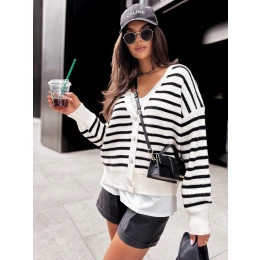Dámsky sveter BREEZY je ideálny na jeseň, má dlhé rukávy a dlhší strih pre výnimočné pohodlie. Jeho nadčasové pruhy dodávajú vzhľadu charakter, zatiaľ čo výstrih do V zvýrazňuje krk. Sveter sa zapína aj na štýlové gombíky, ktoré mu dodávajú nádych elegancie. Ideálna voľba na chladnejšie jesenné dni.