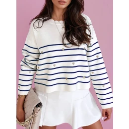 Kombinácia elegancie a pohodlia. Je vyrobený z tkaniny príjemnej na dotyk, poteší vás pohodlným nosením a jedinečným štýlom. Dlhé rukávy vás zahrejú a ozdobný výstrih mu dodáva jedinečný šarm. Tento model zdobia jemné nadčasové prúžky a ozdobné srdiečka pre jedinečný štýl. Bude dokonalým doplnkom vášho jesenného stylingu!