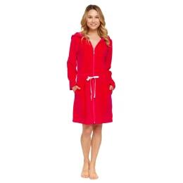 Dámsky župan 1008 red plus Doctornap - malinová farba - vyrobený z kvalitnej bavlny - s vreckami - zapínanie na zips - praktické sťahovanie v páse - s kapucňou - dĺžka nad kolená - certifikát OEKO-TEX Standard 100 Zloženie materiálu: 80% bavlna + 20% polyester