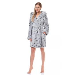 Dámsky krátky župan 9135 L&L - z mäkkého materiálu - sivá farba s grafitovými hviezdičkami - má vrecká a zaväzovanie v páse - s kapucňou