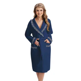 Elegantný dámsky velúrový župan. Golier a vrecká sú zdobené čipkou.