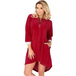 Dámsky velúrový župan Lilie. Župan je vyrobený z mäkkého, savého velúru, ktorý príjemne hreje. Je vybavená dvoma skrytými bočnými vreckami. 3/4 rukávy sú zakončené bielou kvetinovou čipkou. Zadná časť má v strede malý rozparok a je strihaná so šatami.
