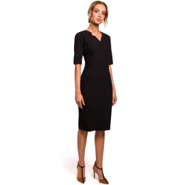 Jemné a elegantné ceruzkové šaty so zvýšeným pásom a výstrihom do V. Krátke rukávy s krytým zipsom. Bez podšívky. Jemný kancelársky štýl v najlepšom svetle.