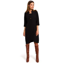 Elegantné šaty so žakárovým strihom. Jedinečný strih so skrytým záhybom zapínaným vpredu na miniatúrne patentky a vzadu na gumu. Vysoký golier, ramienka a decentné gombíky v jantárovej farbe dodávajú šatám rafinovaný nádych. Šaty sú bez podšívky.