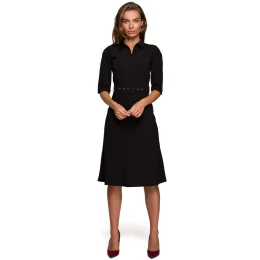 Klasická hladká látka, výrazný pás s krytou sponou a golier podčiarkujú eleganciu dizajnu. Jemný výstrih s krytým zipsom umožňuje zmeniť charakter šiat jediným pohybom. Veľmi štýlové!