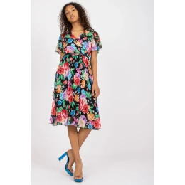 Letné šaty z kvetinovej tkaniny s rozšíreným strihom, krátkymi rukávmi, obálkovým výstrihom a nariaseným lemom. Šaty majú podšívku a opasok.