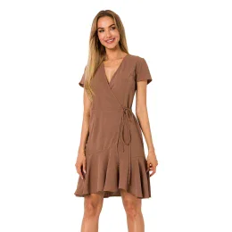Prekrývajúce sa šaty zo vzdušnej tkaniny, zaväzované na boku a s volánom. Krátke rukávy, bez podšívky.
