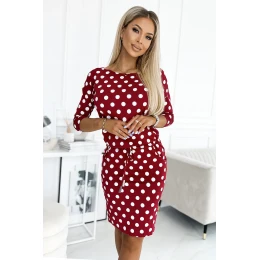 Športové šaty s viazaním, vreckami, lodičkovým výstrihom a 3/4 rukávmi. Šaty vo vínovej farbe s bielymi bodkami. Vyrobené z príjemnej na dotyk elastickej tkaniny. Značka Numoco. Poľská výroba.