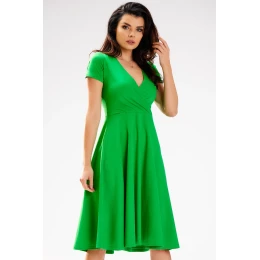 Midi šaty s krátkymi rukávmi a obálkovým výstrihom. Šaty krásne tvarujú siluetu, zvýrazňujú prednosti a zároveň zakrývajú nedostatky. Navrhnuté a ušité v Poľsku.