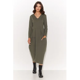 Tieto šaty s dĺžkou po kolená sú vyrobené z teplákového úpletu a sú k dispozícii v khaki, pieskovej a čiernej farbe. Majú dlhé rukávy, výstrih do V a vrecká, čo im dodáva ležérny štýl. Spodná časť šiat je tiež veľmi ležérna. Šaty majú našitú ozdobnú etiketu. Výhodou týchto šiat je nepochybne ich voľný strih, ktorý jemne zvýrazňuje siluetu. Môžete ich nosiť na viac alebo menej formálne stretnutia, v závislosti od doplnkov, ktoré si zvolíte.
