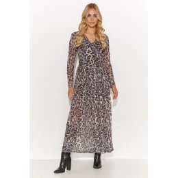 Tieto jedinečné dlhé šaty z ľahkého materiálu nesmú chýbať vo vašom šatníku. Trojuholníkový výstrih a dlhé rukávy dodávajú šatám ležérny štýl a praktické každodenné využitie. Bočné rozparky zasa dodávajú šatám ľahkosť. Dôležitým prvkom je všitá viskózna podšívka, ktorá diskrétne zakrýva strategické miesta. Vonkajší materiál je napoly priehľadný, s potlačou. Tvorba je k dispozícii v piatich variantoch, ktoré sa líšia farbou a vzorom. Každý z nich je ideálnou kombináciou s lodičkami alebo lodičkami a elegantným kabátom. Tieto šaty vám dodajú pocit jedinečnosti a sú vhodné na mnohé príležitosti, od romantickej večere až po spontánnu prechádzku po meste.