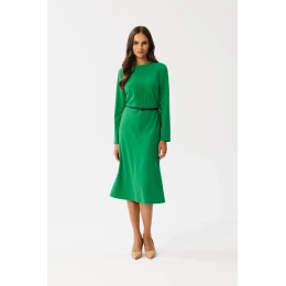Tieto šaty vynikajú ozdobným prešívaním pri výstrihu, ktoré im dodáva šarm. Rozparok v páse zvýrazňuje pás a priložený opasok z umelej kože je štýlovým doplnkom. Dlhé rovné rukávy sú univerzálne a módne. Spodná časť šiat je strihaná so šikmým lemom s prešívaním v strede pre ľahký vzhľad. Vďaka dĺžke pod kolená sú šaty vhodné na mnohé príležitosti. Krytý zips na zadnej strane uľahčuje obliekanie. Šaty sú bez podšívky pre pohodlné nosenie. Tieto šaty boli navrhnuté a ušité v Poľsku, čo svedčí o ich kvalite a jedinečnosti. Dodajú vám sebavedomie a štýl na rôzne príležitosti.