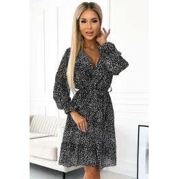 Šifónové šaty s volánovým lemom, výstrihom, dlhými rukávmi a opaskom. Šaty z čiernobielej vzorovanej látky. Značka numoco basic. Európska výroba.