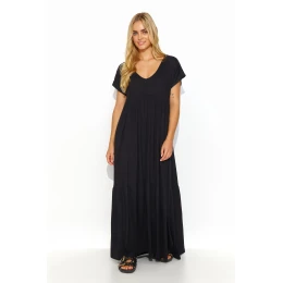 Viskózové šaty sú vzdušné, ležérne a stále veľmi módne. Naše voľné maxi šaty majú na dvoch miestach prešitie, ktoré vytvára nápadné záhyby. Výstrih do V krásne odhaľuje poprsie a kľúčne kosti. Ďalším zaujímavým prvkom je minimalistická pozlátená kovová platnička všitá do zadnej časti šiat. Tento model je dokonalým návrhom na ležérny outfit, ktorý možno doplniť športovou obuvou, sandálmi alebo čižmami. Tieto šaty si zamilujú ženy, ktoré ocenia ležérny štýl, pohodlie a nadčasovosť.