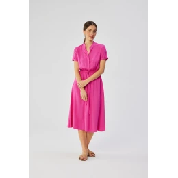 Tyto šaty z vysoce kvalitní viskózové tkaniny, vyrobené výhradně v Polsku, jsou kombinací elegance, pohodlí a místního řemeslného umění. Tkanina ze 100% viskózy zaručuje měkkost, jemnost a potěšení z nošení a zároveň vytváří mírně rozšířený střih šatů. V pase mají šaty stahovací šňůrku, která jemně zvýrazní ženské křivky a přizpůsobí je individuálním preferencím. Horní část šatů se rozepíná, což usnadňuje jejich oblékání a svlékání a dodává jim prvek praktičnosti. Pod krkem je stojáček, který šatům dodává sofistikovaný nádech. Krátké rukávy s mírným ohrnutím dodávají šatům lehký a svěží nádech a dokonale se hodí k letním stylům. Za zmínku stojí, že šaty nemají žádnou podšívku, díky čemuž látka dokonale přiléhá k tělu a zároveň zůstává lehká a vzdušná. Navrhování a šití v Polsku klade důraz na místní výrobu, což je další výhoda pro uvědomělé spotřebitele, kteří oceňuj