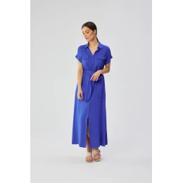 Tyto šaty na knoflíky, vytvořené z vysoce kvalitní 100% viskózy, jsou výjimečným kouskem oděvu, hrdě navrženým a ušitým v Polsku. Tyto maxi šaty vyzařují eleganci a pohodlí a vytvářejí harmonii mezi stylem a funkčností. Střih šatů s mírně rozšířeným průstřihem poskytuje volnost pohybu a zároveň je ideální pro různé příležitosti. Límec dodává šatům elegantní a šik nádech a celkovému vzhledu propůjčuje sofistikovaný nádech. Krátké kimonové rukávy dodávají stylingu lehkost a svěžest. Šaty se vpředu zapínají na knoflíky, což nejen usnadňuje jejich oblékání a svlékání, ale také jim dodává jemný retro nádech. Na úrovni prsou jsou ozdobné klopy, které šatům dodávají další půvab a originalitu. V pase je umístěn pásek na zavazování, který umožňuje přizpůsobit šaty individuálním preferencím a zároveň zdůraznit ženské křivky. Za zmínku stojí, že šaty nemají žádnou podšívku, díky čemuž viskózová