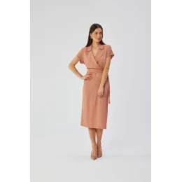 Šaty s jedinečným střihem a vynikajícím zpracováním, vytvořené z jemné tkaniny, v sobě spojují eleganci a funkčnost. Jejich obálkový vršek s límečkem dodává stylingu jemnost a zároveň zdůrazňuje ženský půvab. Krátké kimonové rukávy dodávají šatům lehkost a modernost. Rovný střih šatů, opatřený páskem na zavázání v pase, umožňuje přizpůsobení a zároveň jemně zvýrazňuje ženské křivky. Na zadní straně, v úrovni pasu, se nachází elastický pásek, který zajišťuje, že se šaty pohodlně nosí a dokonale se přizpůsobí postavě. Midi délka dodává šatům univerzálnost, takže se hodí jak na formální schůzky, tak i na neformálnější příležitosti. Díky absenci podšívky látka jemně leží na těle a zároveň zůstává lehká a vzdušná. Na zadní straně šatů byl umístěn rozparek, který celkovému vzhledu dodává jemný nádech a dále usnadňuje pohyb. Jedná se nejen o elegantní oděv, ale také o vyjádření podpory