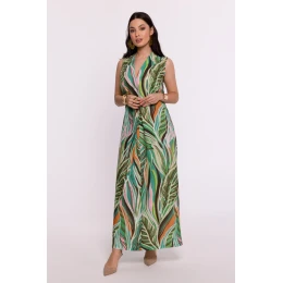 Tieto šaty výnimočného dizajnu z ľahkej tkaniny s originálnou potlačou sú skutočnou poctou remeslu poľských návrhárov. Tento model sú maxi šaty, ktorých charakter zdôrazňuje zmyselný výstrih do V. Okrem toho je pod výstrihom umiestnené elegantné prekrytie, ktoré dodáva celku jemnosť a štýl. Šaty sú praktické a rýchlo sa obliekajú, pretože sa nosia cez hlavu, takže ich nosenie je veľmi pohodlné. Strih bez rukávov dodáva šatám ľahkosť a vzdušnosť. Absencia podšívky zdôrazňuje ľahkosť materiálu a umožňuje pokožke voľne dýchať. Na boku šiat je jemný rozparok, ktorý dodáva kreácii rafinovaný pohyb a zdôrazňuje ženskú siluetu. Tkanina s originálnou potlačou je jedinečným prvkom, ktorý šatám dodáva osobný nádych a robí ich jedinečnými. Šaty sa navrhujú a vyrábajú v Poľsku, čo je dôkazom angažovanosti v módnom priemysle tejto krajiny. Tieto šaty sú nielen výrazom individuálneho štýlu, ale aj hrdosti na poľské dedičstvo tvorivosti a remeselnej zručnosti.