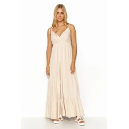 Tieto dlhé letné šaty, rozdelené na segmenty, ktoré imitujú jemné volány, sú kvintesenciou ľahkosti a romantiky. Šaty sa viažu tenkými šnúrkami, ktoré im dodávajú jedinečnú jemnosť a voľnosť pohybu. Prekrývajúci sa výstrih do V jemne zvýrazňuje poprsie a dodáva kreácii ženský pôvab. Ozdobná zlatá platnička všitá do zadnej časti dodáva šatám eleganciu a jedinečný šarm. Letná kreácia sa dodáva v rôznych farbách, aby vyhovovala individuálnym preferenciám a štýlu.
