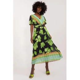 Letné šaty s krátkymi rukávmi v podobe volánov. Šaty s podšívkou. Obálkový výstrih, zapínanie na opasok v páse, nariasený lem. Ideálne na mnohé príležitosti.