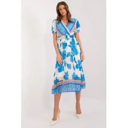 Letné šaty s krátkymi rukávmi v podobe volánov. Šaty s podšívkou. Obálkový výstrih, zapínanie na opasok v páse, nariasený lem. Ideálne na mnohé príležitosti.