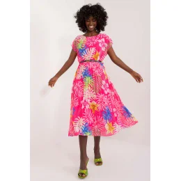 Letné šaty s krátkymi rukávmi, okrúhlym výstrihom a rozšíreným lemom. Šaty z farebnej vzorovanej látky s podšívkou. Ideálne na mnohé príležitosti.