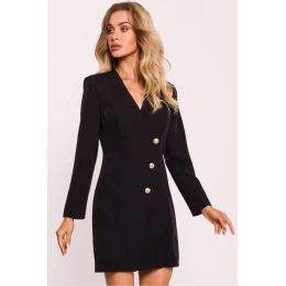 Šaty Sakos s golierom sú vyrobené z elegantnej tkaniny a ponúkajú jedinečnú kombináciu klasického a moderného štýlu. Nešitý strih poskytuje voľný, uvoľnený strih, ktorý je ideálny na každodenné i formálne príležitosti. Dlhé rukávy a ozdobné zlaté gombíky na prednej strane, ktoré sa nerozopínajú, dodávajú šatám eleganciu a pôvab. Na zadnej strane je skrytý zips, vďaka ktorému sa šaty ľahko obliekajú a vyzliekajú. Šaty majú dĺžku nad kolená a sú bez podšívky, takže sú ľahké a pohodlné. Navrhnuté a ušité v Poľsku spájajú najvyššiu kvalitu spracovania s moderným dizajnom.