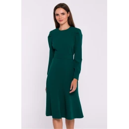 Elegantné tkané šaty s mierne rozšíreným strihom, ktoré sú ideálne na rôzne príležitosti. Dlhé rukávy s náramenníkmi dodávajú šatám módny nádych a manžety s gombíkmi zdôrazňujú dôraz na detail. Šaty majú okrúhly výstrih a krytý zips na chrbte, ktorý zaručuje pohodlné nosenie a minimalistický vzhľad. Opasok zapínaný na dva štvorcové gombíky tiež krásne zvýrazňuje pás. Šaty nemajú podšívku, takže sú ľahké a pohodlné. Navrhnuté a ušité v Poľsku sú ideálnou voľbou pre ženy, ktoré ocenia štýl a kvalitu.