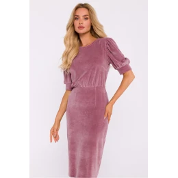 Tieto elegantné šaty z mäkkého velúrového úpletu spájajú pohodlie s rafinovaným štýlom. Strih v páse dokonale zvýrazňuje pás a ceruzkový lem siahajúci až po kolená dodáva celým šatám klasický charakter. Krátke manžetové rukávy dodávajú šatám jemnú eleganciu a na chrbte je rozparok, ktorý umožňuje voľnosť pohybu a vnáša do stylingu ľahkosť. Model je bez podšívky, vďaka čomu je ľahký a pohodlný na nosenie. Šaty sa zapínajú na bočnej strane na krytý zips, ktorý zabezpečuje diskrétne zapínanie. Tieto šaty navrhnuté a vyrobené v Poľsku sú ideálnou voľbou na špeciálne príležitosti, pri ktorých sú elegancia a štýl prvoradé.