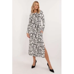 Každodenné šaty slim fit strihu strednej dĺžky s moderným geometrickým vzorom, ideálne do práce aj na večierok. Sú vyrobené z mäkkej a elastickej zmesi viskózy a elastanu, dokonale sa prispôsobia postave a zabezpečia pohodlie pri nosení. Šaty majú dlhé rukávy a voľný výstrih, ktorý im dodáva eleganciu a rafinovanosť. Nemajú zapínanie, čo im dodáva minimalistický charakter, a pás so šnurovaním zvýrazňuje postavu, čím dodáva celkovému vzhľadu ženský nádych.