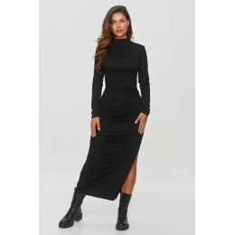 Přizpůsobené šaty jsou stylovou a elegantní kreací, ideální na chladnější dny. Mají dlouhý rukáv a rolák, co jí dodává klasický a minimalistický vzhled. Střih šatů je přiléhavý, zdůrazňující postavu. Charakteristickým prvkem jsou záhyby po obou stranách, které jí dodávají originalitu a jemně modelují postavu. Model má po straně rozparek, které šatě dodávají ženský charakter a dělají je pohodlnější na nošení. Délka sahá až k kotníkům, co z ní činí ideální volbu jak na formální příležitosti, tak na více neformální vycházky. Šaty mají stylový šev vpředu i vzadu. Stylizace byla dokončena masivními, černými botami na tlusté podrážce, co celku dodává lehce rockový charakter.
