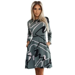 Trapézové šaty Numoco sú pohodlnou ponukou na chladné dni. Sú vyrobené z hrejivého materiálu v olivovo-čierno-béžovom vzore a sú ideálne na každodenné štylizácie. Šaty majú dlhé rukávy, vrecká na sukni a čierny opasok, ktorý možno voliteľne nosiť na zvýraznenie pásu. Poľský výrobok s voľným, moderným strihom.