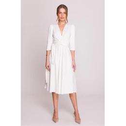 Elegantné a pohodlné šaty z modalovej tkaniny, ktoré dokonale spájajú pohodlie so ženským štýlom. Priliehavý vrchný diel a výstrih do V jemne zvýrazňujú siluetu a šnurovačka v páse umožňuje ideálne prispôsobenie postave. Mierne rozšírená spodná časť dodáva šatám ľahkosť a voľnosť pohybu. Klasická dĺžka po kolená a 3/4 rukávy z nich robia univerzálnu voľbu na rôzne príležitosti. Šaty sa nosia cez hlavu, bez zbytočného zapínania, čo zaručuje pohodlné nosenie. Navrhnuté a ušité v Poľsku z vysokokvalitnej modalovej tkaniny, ktorá je mäkká, priedušná a príjemná na pokožku.