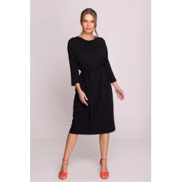 Elegantné šaty v štýle oversize, vyrobené z kvalitného modalového úpletu, ktorý je mäkký, priedušný a veľmi príjemný na pokožku. Voľný strih zaručuje pohodlné nosenie a priložený pás umožňuje zvýrazniť pás podľa vlastných preferencií. Vodorovný výstrih dodáva kreácii elegantný charakter, jemne sa prehýba okolo krku. Šaty majú dĺžku nad kolená a 3/4 rukávy, vďaka čomu sú univerzálnou voľbou na každodenné nosenie aj na špeciálne príležitosti. Model sa nosí cez hlavu, bez zbytočného zapínania. Navrhnuté a ušité v Poľsku s dôrazom na každý detail.