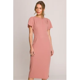 Elegantné a ženské midi šaty s priliehavým strihom, ktorý zvýrazňuje postavu. Priliehavý vrchný diel dodáva klasický charakter, zatiaľ čo hlboký výstrih do V na chrbte dodáva jemnú zmyselnosť. Krátke rukávy zaručujú pohodlie a všestrannosť na rôzne príležitosti. Šaty sa zapínajú na skrytý zips na boku, vďaka čomu skvele priliehajú k telu. Rozparok na boku dodáva ľahkosť a voľnosť pohybu. Navrhnuté a ušité v Poľsku s dôrazom na detail a vysokú kvalitu spracovania. Ideálne na elegantné výlety, večierky a špeciálne príležitosti.