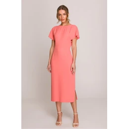 Elegantné a ženské midi šaty s priliehavým strihom, ktorý zvýrazňuje siluetu. Vrchná časť s drapériou im dodáva klasický charakter, zatiaľ čo hlboký výstrih do V na chrbte im dodáva jemnú zmyselnosť. Krátke rukávy poskytujú pohodlie a všestrannosť na rôzne príležitosti. Šaty sa zapínajú na skrytý zips na boku, vďaka čomu dokonale priliehajú k telu. Rozparok na boku dodáva ľahkosť a voľnosť pohybu. Navrhnuté a ušité v Poľsku s dôrazom na detail a vysokú kvalitu spracovania. Ideálne na elegantné výlety, večierky a špeciálne príležitosti.