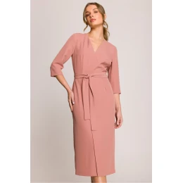 Elegantné a ženské midi šaty s priliehavým strihom, ktorý krásne zvýrazňuje postavu. Vrchný diel s výstrihom do V, čiastočne podšitý, dodáva jemnú ľahkosť a rukávy s dĺžkou 3/4 dodávajú klasický charakter. Prekrývajúca spodná časť zaručuje voľnosť pohybu a zoštíhlenie postavy. Pas je vzadu vybavený gumou, ktorá sa prispôsobí postave, a dodatočný viazaný opasok umožňuje zvýrazniť pás podľa vlastných preferencií. Šaty sa zapínajú na bočný zips, ktorý zaručuje estetické zakončenie. Navrhnuté a ušité v Poľsku s dôrazom na každý detail. Ideálne na špeciálne príležitosti a elegantné výlety.