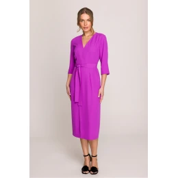 Elegantné a ženské midi šaty s priliehavým strihom, ktorý krásne zvýrazňuje postavu. Vrchný diel s výstrihom do V, čiastočne podšitý, dodáva jemnú ľahkosť, zatiaľ čo 3/4 rukávy dodávajú klasický charakter. Prekrývajúca spodná časť zaručuje voľnosť pohybu a zjemňuje postavu. V zadnej časti pásu je vložená gumička, ktorá sa prispôsobí postave, a dodatočný uviazaný opasok umožňuje zvýrazniť pás podľa vlastných preferencií. Šaty sa zapínajú na skrytý zips na bokoch, čo zaručuje estetické zakončenie. Navrhnuté a ušité v Poľsku s dôrazom na každý detail. Ideálne na špeciálne príležitosti a elegantné výlety.
