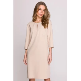 Voľné a pohodlné šaty s voľným strihom, ktoré siahajú pred kolená. Majú 3/4 dlhé rukávy a výstrih s jemným výstrihom zdobeným elegantným gombíkom. Vzadu sa zapínajú na skrytý zips a v spodnej časti majú jemný rozparok, ktorý poskytuje väčšiu voľnosť pohybu. Model bez podšívky, ideálny na rôzne príležitosti. Šaty boli navrhnuté a ušité v Poľsku z vysokokvalitnej tkaniny, ktorá zaručuje pohodlie pri nosení a štýlový vzhľad.