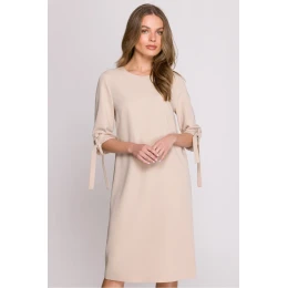 Šaty v tvare písmena A, ktoré jemne zvýrazňujú postavu a zároveň si zachovávajú elegantný a pohodlný charakter. Sú vyrobené z vysokokvalitnej tkaniny, ktorá poskytuje pohodlie počas celého dňa. Dĺžka nad kolená im dodáva univerzálnosť, takže sú ideálnou voľbou na každodenný život aj formálne udalosti. 3/4 rukávy s ohrnutím a jemnými viazankami im dodávajú ľahkosť a ženskosť. Okrúhly výstrih jemne zvýrazňuje krk a skrytý zips na chrbte zabezpečuje jednoduché obliekanie. Šaty boli navrhnuté a ušité v Poľsku, čo zdôrazňuje ich vysokú kvalitu a dôraz na detail. Nie sú podšité, takže sú ešte ľahšie a voľnejšie na nosenie. Ideálna voľba pre ženy, ktoré oceňujú eleganciu, jednoduchosť a pohodlie.