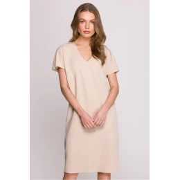 Šaty s voľným strihom, ktorý poskytuje voľnosť pohybu a pohodlie počas celého dňa. Dĺžka po kolená z nich robí univerzálnu voľbu na mnohé príležitosti. Krátke rukávy dodávajú ľahkosť, čo je ideálne na teplejšie dni. Výstrih do V jemne zvýrazňuje krk, čím dodáva šatám ženský charakter. Skrytý zips na chrbte zaručuje pohodlie pri obliekaní a dodatočný rozparok na chrbte dodáva šatám trochu elegantného akcentu. Šaty sú bez podšívky, vďaka čomu sú ešte priedušnejšie a pohodlnejšie. Navrhnuté a ušité v Poľsku, čo zaručuje vysokú kvalitu spracovania a pozornosť venovanú detailom. Ide o skvelú voľbu pre ženy, ktoré oceňujú štýl, pohodlie a eleganciu v každodennom oblečení.