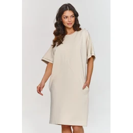 Šaty s krátkými rukávy jsou skvělou volbou pro ženy, které ocení jednoduchost a eleganci ve svých každodenních stylizacích. Jejich volný střih s lehkými detaily, jako jsou prošívání na přední straně, jí dodávají moderní a zároveň univerzální charakter. Široký rukáv sahající k lokti přináší volný, ležérní akcent a zároveň zůstává elegantní. Výstřih šatů má klasický, kulatý tvar, který jemně zdůrazňuje krk a zachovává jednoduchost kreace. Kapsy na bocích jsou praktickým prvkem, který přidává funkcionalitu a zároveň zachovává minimalistický vzhled. Model má délku před kolena, což dokonale zdůrazní nohy a vytvoří svěží, lehký vzhled. Šaty lze kombinovat s mnoha stylizacemi a jsou skvělým pozadím pro módní doplňky. Můžete je spojit s elegantními doplňky na večerní vycházku nebo s ležérními na běžné nošení. Díky jednoduchému, ale efektnímu střihu jsou ideální základ pro každodenní nošení, do práce,