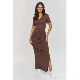 Sukně s drapováním je návrh, který spojuje eleganci a třídu. Vyrobená z měkkého materiálu se ideálně přizpůsobuje postavě, zdůrazňující její tvary. Drapování na bocích jí dodává moderní charakter a decentně modeluje postavu, zatímco výstřih ve tvaru písmene "V" zjemňuje krk. S rozparkem na straně získává šaty lehkost a smyslnost, což z nich činí skvělou volbu na různé příležitosti. Maxi délka vytváří elegantní, prodlužující efekt, který vám dodá sebejistotu. Model je vyroben z pružného materiálu, což zajišťuje pohodlí po celý den. Skvěle vypadá jak ve spojení s bílými teniskami na každý den, tak s elegantními botami na večerní výlety. Navíc díky své univerzální povaze bude skvělou volbou na každé roční období. Tato sukňová šaty s drapováním a maxi délkou je návrh pro ženy, které si váží pohodlí, ale nechtějí se vzdát elegantního vzhledu. S její pomocí si vytvoříte stylizace na každou příležitost.