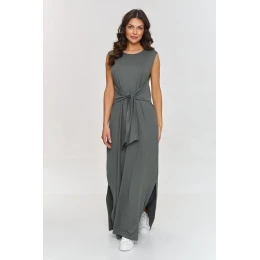 Elegantní maxi šaty vyrobené z lehké viskózové pleteniny jsou ideální volbou na jarní a letní dny. Vyznačují se volným střihem a pohodlným vázáním v pasu, které přidává ženskosti a umožňuje přizpůsobení šatů postavě, zajišťujíc zároveň pohodlí po celý den. Kulatý výstřih zajišťuje univerzálnost a absence rukávů z ní dělá skvělou volbu pro teplé dny. Maxi délka jí dodává eleganci a boční rozparky koketnosti a lehkosti, zároveň do outfitu vnášejí dynamický a moderní akcent. Šaty mají klasický a minimalistický střih, který se skvěle hodí jak do každodenních, tak do formálnějších kombinací. Jedná se o univerzální volbu, která pasuje k různým příležitostem. Kombinuj je se sportovními botami na běžné nošení nebo elegantními sandály, což z nich činí ideální volbu pro výlety do města, procházky nebo víkendový relax.