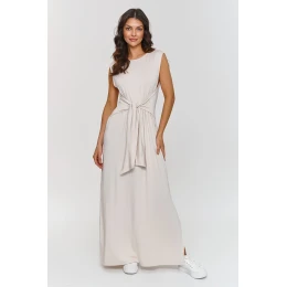 Elegantní maxi šaty vyrobené z lehké viskózové pleteniny jsou ideální volbou na jarní a letní dny. Vyznačují se volným střihem a pohodlným vázáním v pasu, které dodává ženskosti a umožňuje přizpůsobení šatů postavě, zajišťující přitom pohodlí po celý den. Kulatý výstřih zajišťuje univerzálnost a absence rukávů z ní dělá skvělou volbu na teplejší dny. Maxi délka jí dodává eleganci a boční rozparky koketnosti a lehkosti, zároveň do stylizace přináší dynamický a moderní akcent. Šaty mají klasický a minimalistický střih, který se skvěle hodí jak do každodenních, tak do formálních kombinací. Je to univerzální volba, která se hodí na různé příležitosti. Kombinujte je se sportovními botami na běžné nošení nebo elegantními sandály, což z ní udělá ideální volbu na výlety do města, procházky nebo víkendový relax.