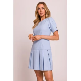 Mini šaty z kvalitnej bavlnenej tkaniny, ktorá zaručuje pohodlie a priedušnosť. Strih s predĺženým pásom jemne zvýrazňuje postavu a protizáhyb v spodnej časti im dodáva ľahkosť a eleganciu. Krátke rukávy sú zdobené švami a ozdobnými gombíkmi, čo celku dodáva výnimočný charakter. Šaty sa vzadu zapínajú na skrytý zips bez podšívky, čo zaručuje, že sú ľahké a pohodlné na nosenie. Navrhnuté a ušité v Poľsku so starostlivosťou o každý detail.