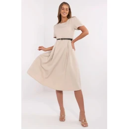 Tieto klasické a ženské šaty s rozšíreným strihom sú skvelou voľbou pre ženy, ktoré oceňujú eleganciu a pohodlie. Sú vyrobené z mäkkého, elastického materiálu (polyester s prímesou elastanu), krásne sa skladajú na postave a poskytujú voľnosť pohybu. Model v midi dĺžke s krátkymi rukávmi a okrúhlym výstrihom je vhodný do práce aj na spoločenské udalosti. Jemné záhyby na ramenách a v páse dodávajú jemný objem a zvýrazňujú pás, zatiaľ čo zopnutý pás ešte viac zdôrazňuje ženskú siluetu. Hladký materiál v kombinácii s jednoduchými líniami a zapínaním na zips na chrbte vytvárajú nadčasový vzhľad, ktorý sa hodí k elegantným doplnkom.