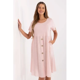 Lehké, rozklosané letní šaty jsou skvělou volbou pro každodenní stylizace. Vyrobené z přírodní bavlny, zajistí prodyšnost a pohodlí i v horkých dnech. Různorodá struktura materiálu dodává šatům charakter a jemnou originalitu. Střih pod prsy jemně zdůrazňuje postavu a dodává šatům dívčí půvab. Krátký rukáv a kulatý výstřih vytvářejí klasické a pohodlné provedení, ideální na každý den. Délka pod kolena činí šaty praktickými a ženskými zároveň. Model je zdoben řadou dekorativních knoflíků vpředu, které tvoří stylový detail, zdůrazňující lehce retro charakter šatů. Další výhodou jsou diskrétní, ale zároveň velmi funkční kapsy. To jsou ideální letní šaty pohodlné, stylové a plné půvabu, skvěle se hodí jak na procházku, tak i při každodenních povinnostech.